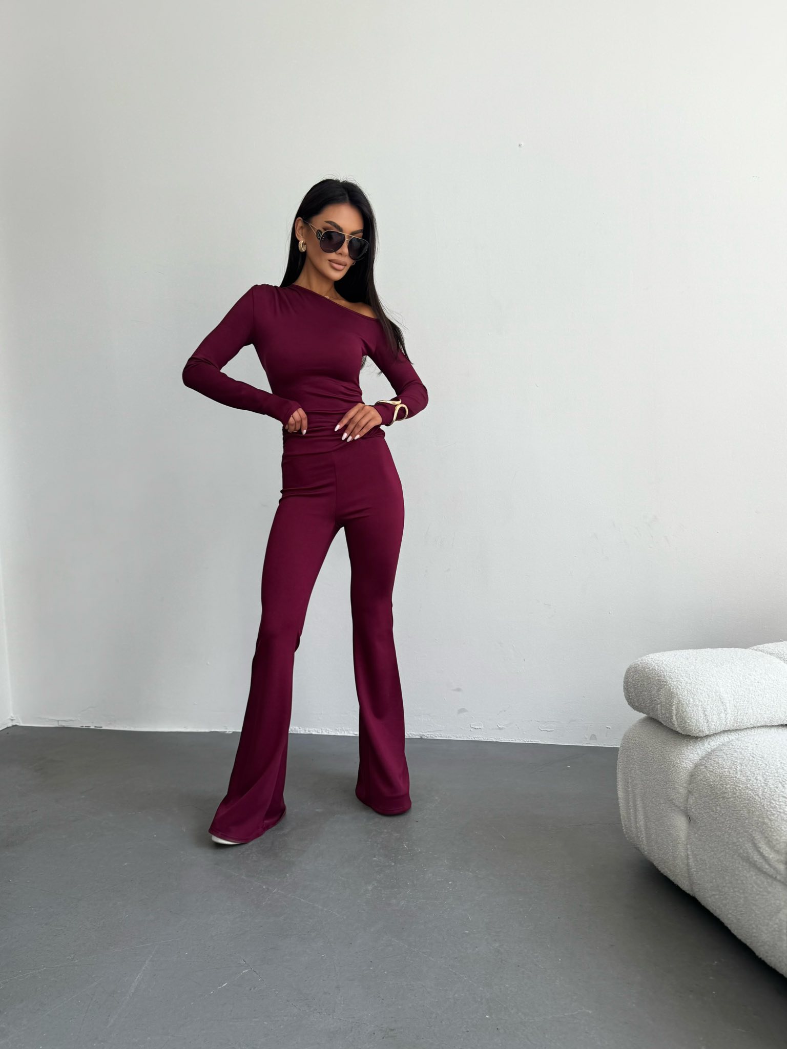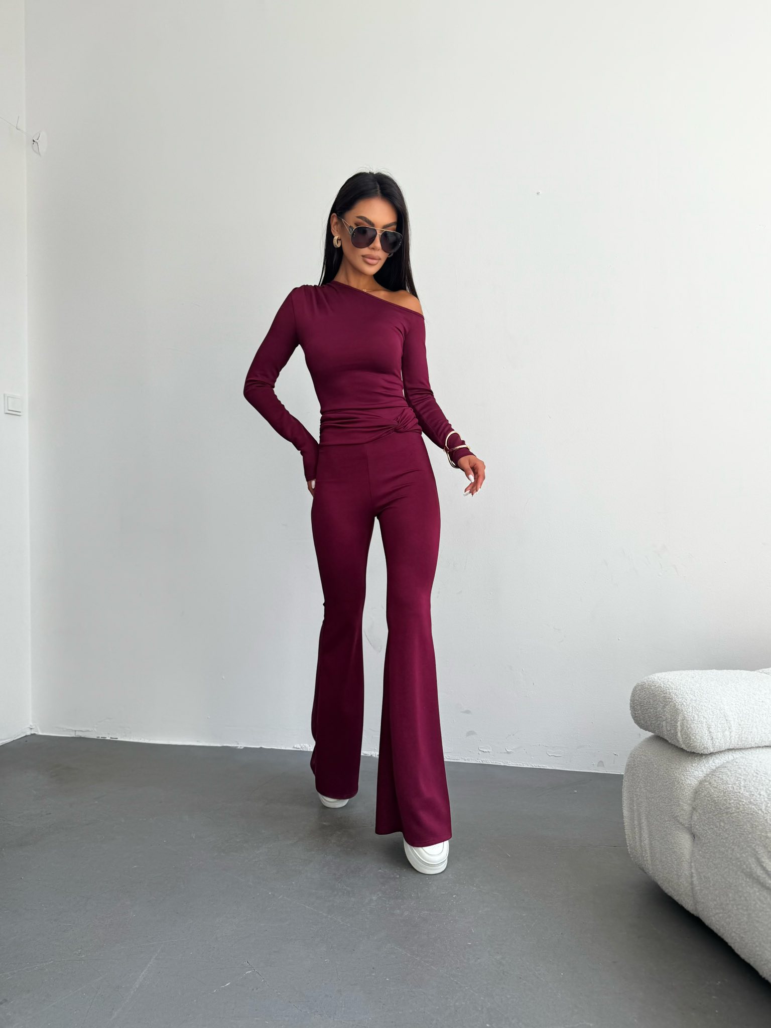 Asymetryczna bluzka FENNI w kolorze bordowym z marszczeniem na ramieniu. Wykonana z elastycznego i przyjemnego w dotyku materiału  który zapewnia wygodę przez cały dzień. Idealne połączenie stworzy ze spodniami MOENE.